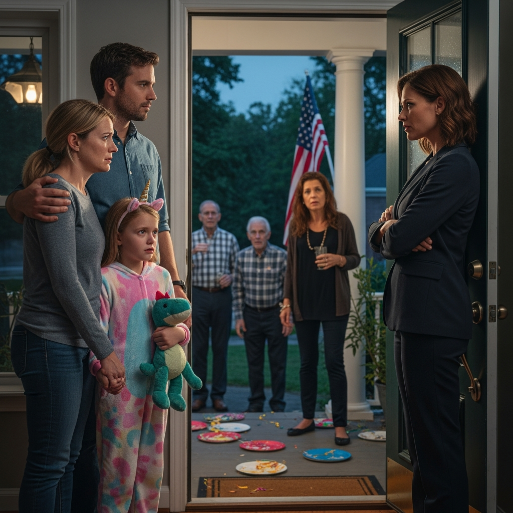 The front door opened again. My mother stepped out, napkin still in her hand like she’d carried dinner manners into battle. She stopped on the porch and looked at us like we were misbehaving children. Her hair was sprayed into place; her lipstick was still perfect.
