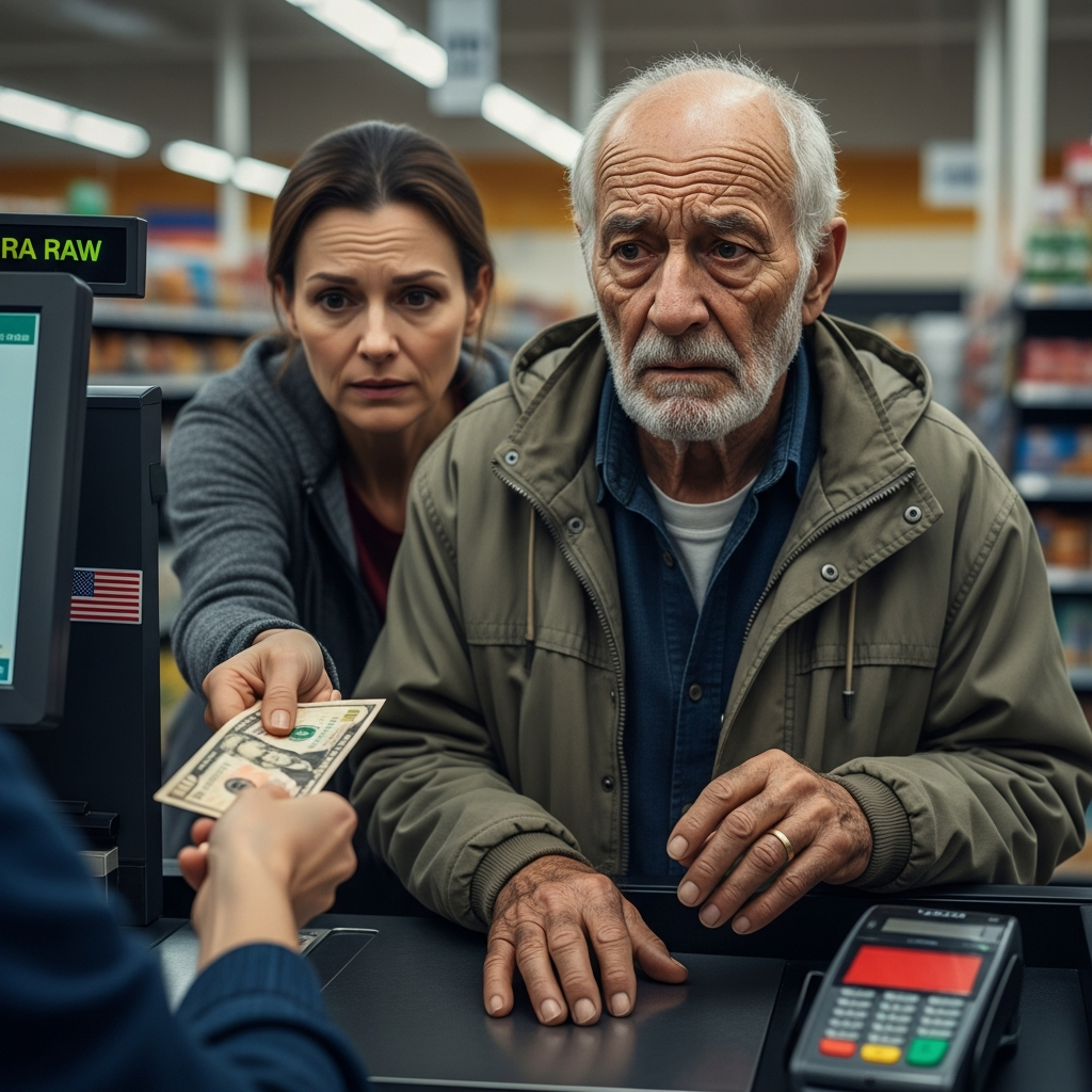 He was standing in the lane marked “15 Items or Fewer,” though it looked like he barely hit six. Bread, peanut butter, milk, a small bag of apples, a box of tea, a jar of something generic. His jacket was thin, the kind of windbreaker people who grew up poor never quite upgrade from. His shoulders were hunched like he wasn’t sure he was supposed to take up that much space in line.