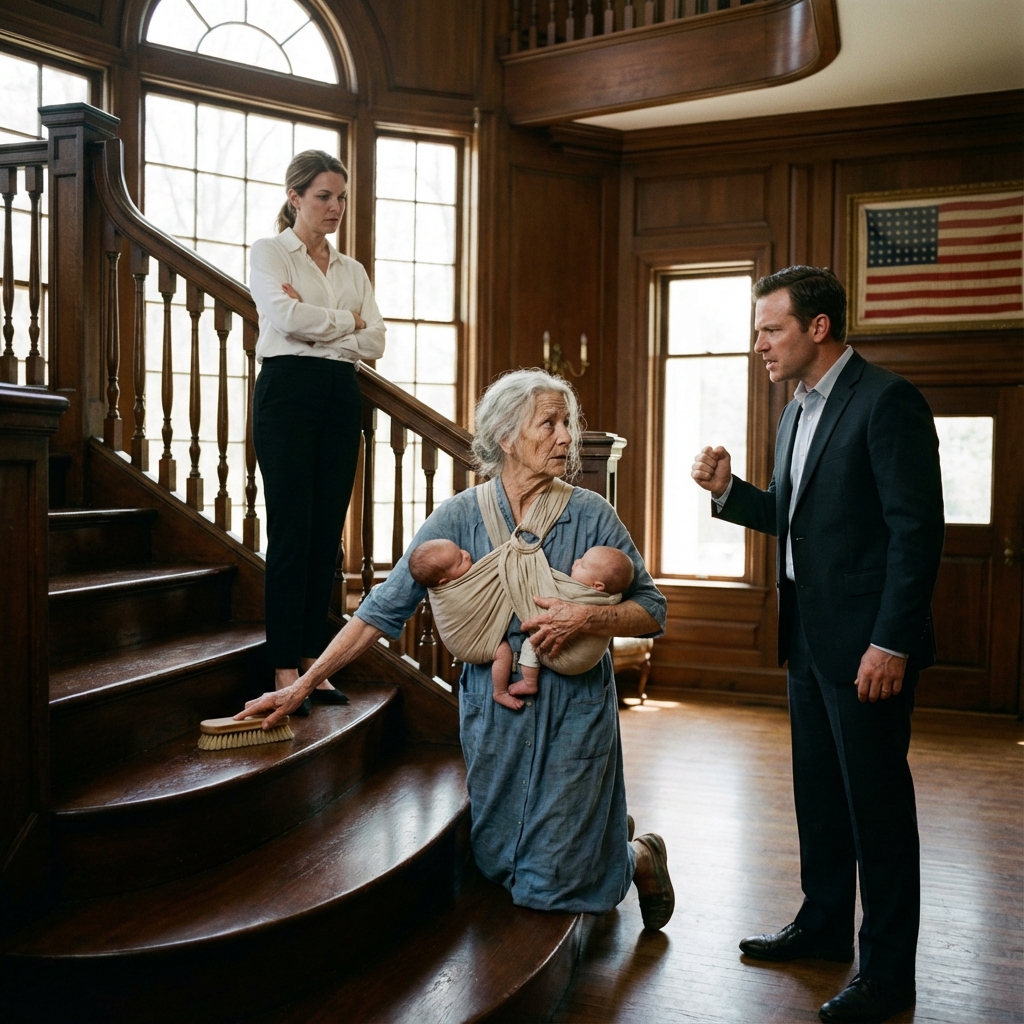 She had a bucket beside her and a sponge in her hand, scrubbing the tile in small circles like she was trying to erase herself. Her face was flushed, her jaw clenched, and the tendons in her neck stood out with effort.