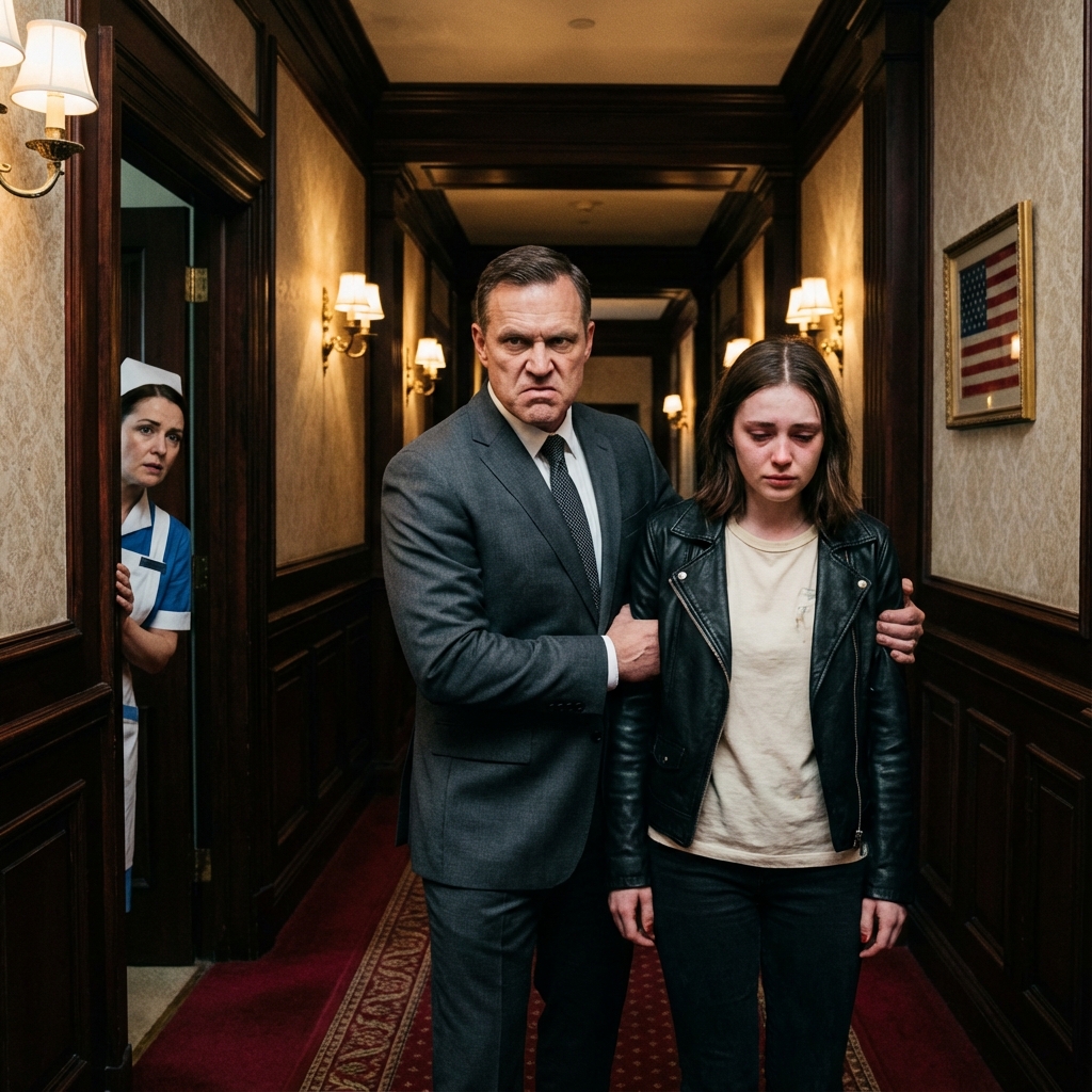 They took the key card and walked out. The girl’s shoes made almost no sound on the tile. The man kept one hand near her back, not touching, just… ready.